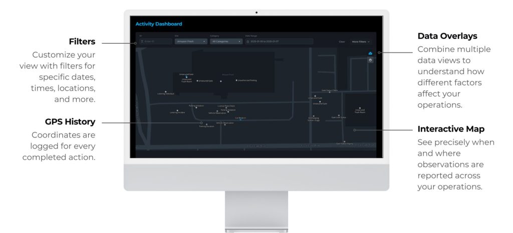 See everything. Focus on what matters. Act instantly. Filter by priority, officer, or observation type, zoom in on exact locations, and review incidents in seconds—without digging through reports. High-resolution images and video keep every detail intact, while instant notifications ensure urgent issues reach the right teams fast.