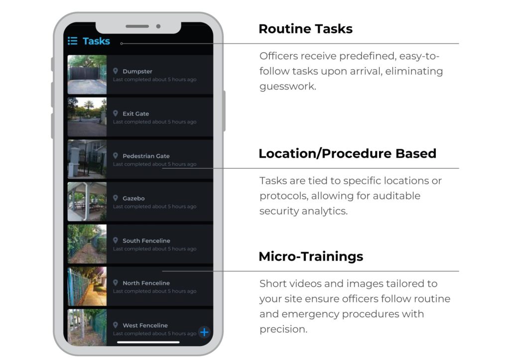 Tasks ensure that security officers follow clear, structured procedures the moment they arrive on-site.